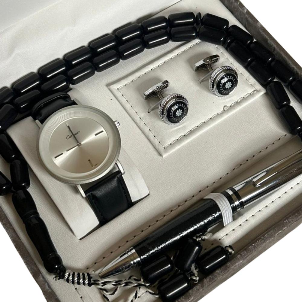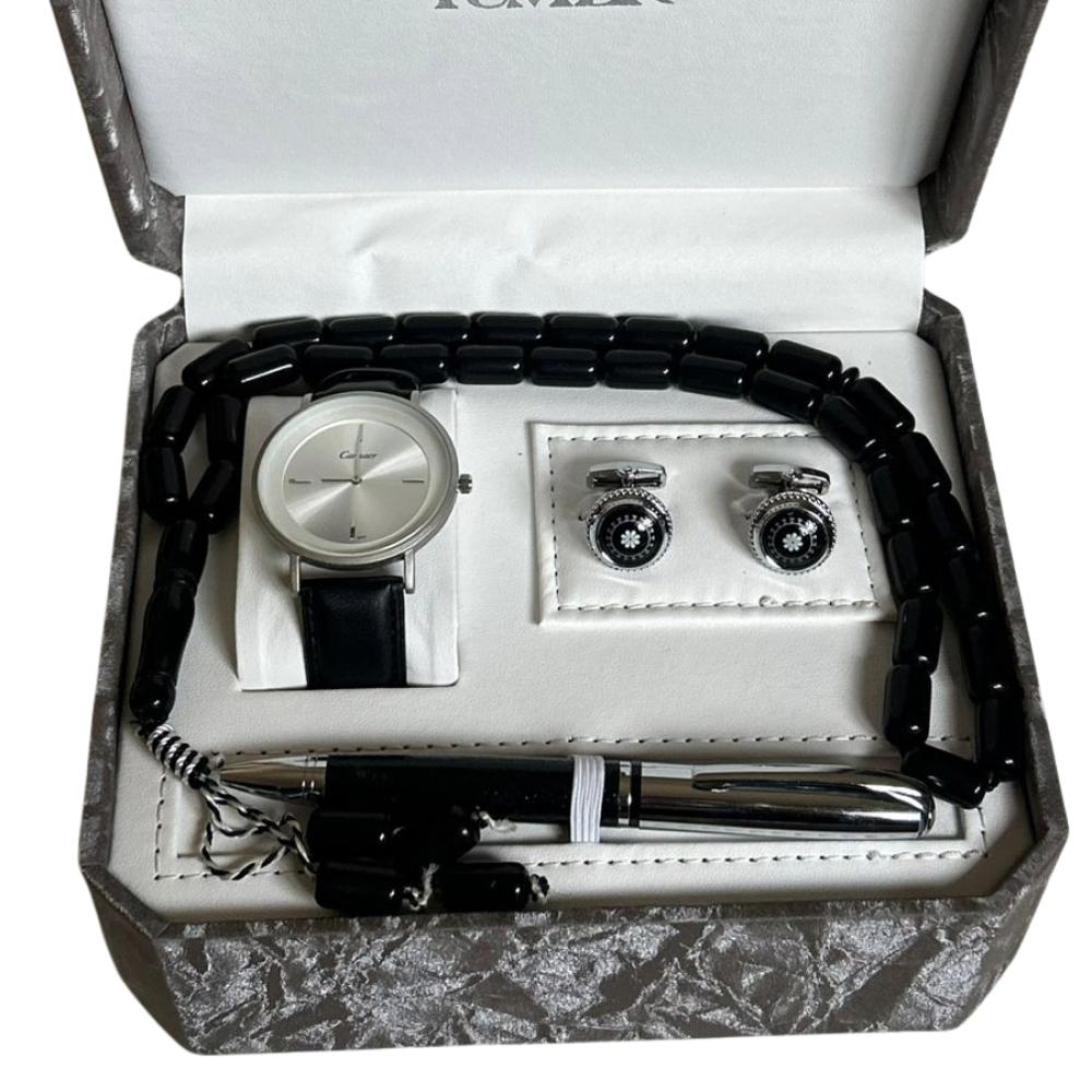 ساعة بتصميم كلاسيكي، كبك أكمام راقي، سبحة أنيقة ..وقلم معدني فاخر